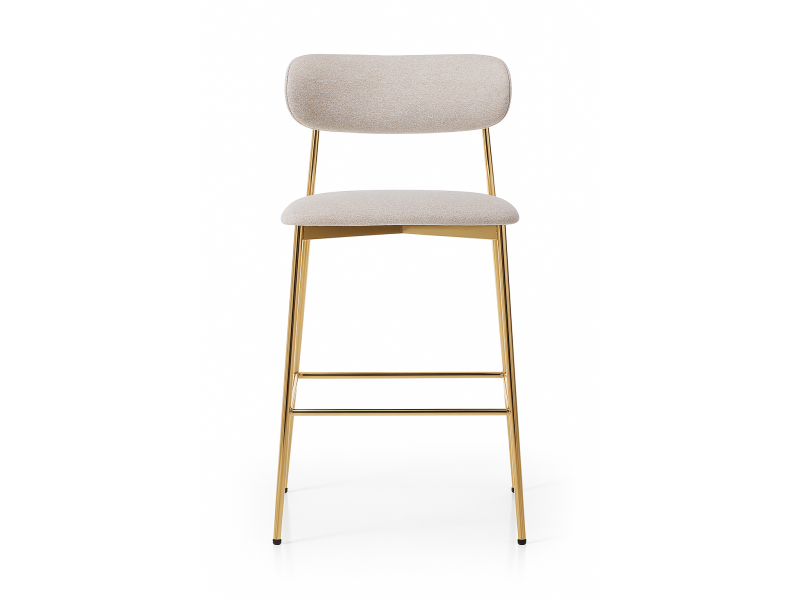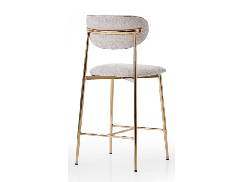 Scaunul de bar Nuvia, cu structură metalică aurie și șezut tapițat, oferă eleganță și confort în orice spațiu — fiind disponibil și în variantă pentru dining.
